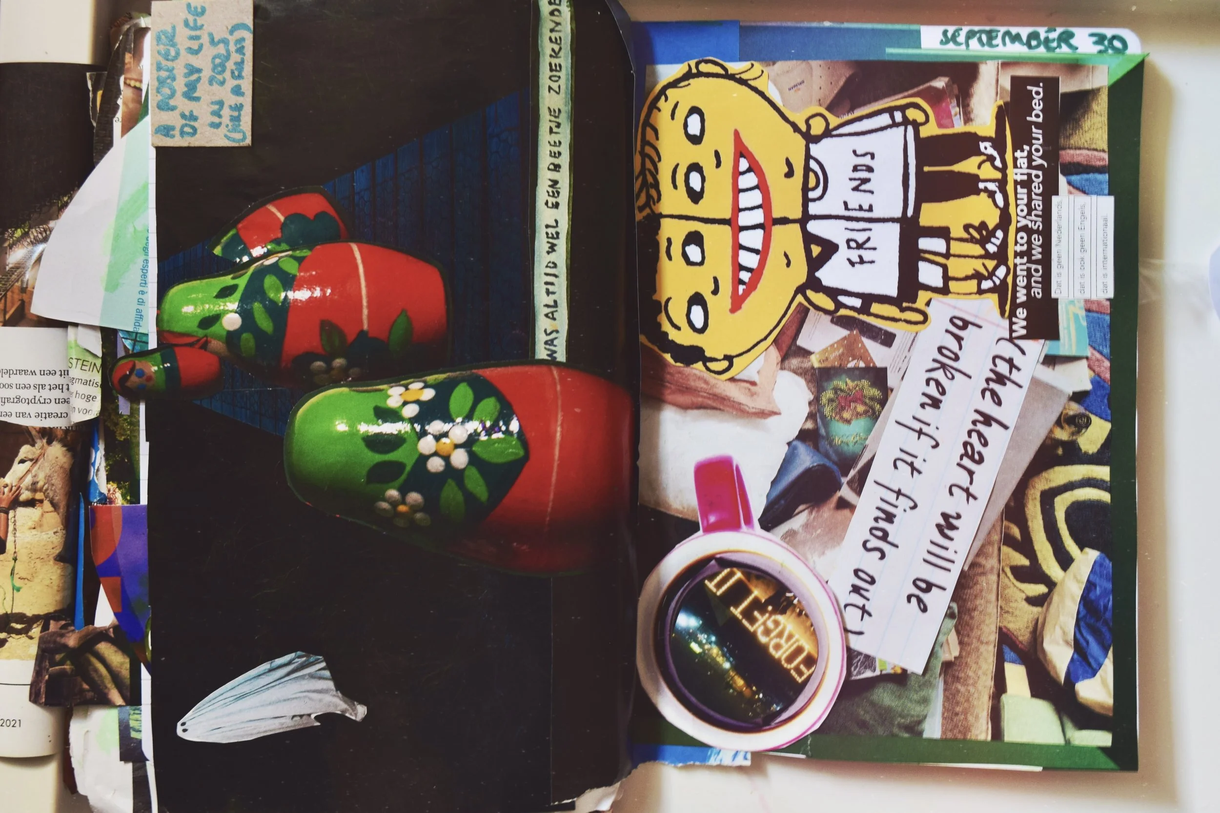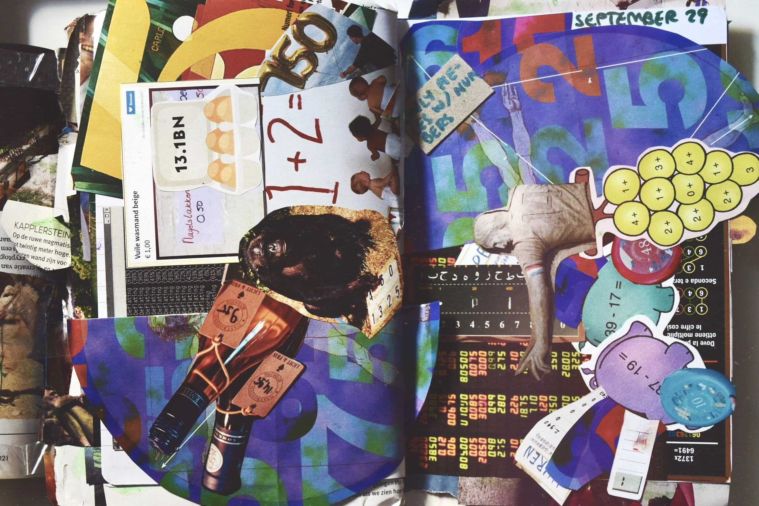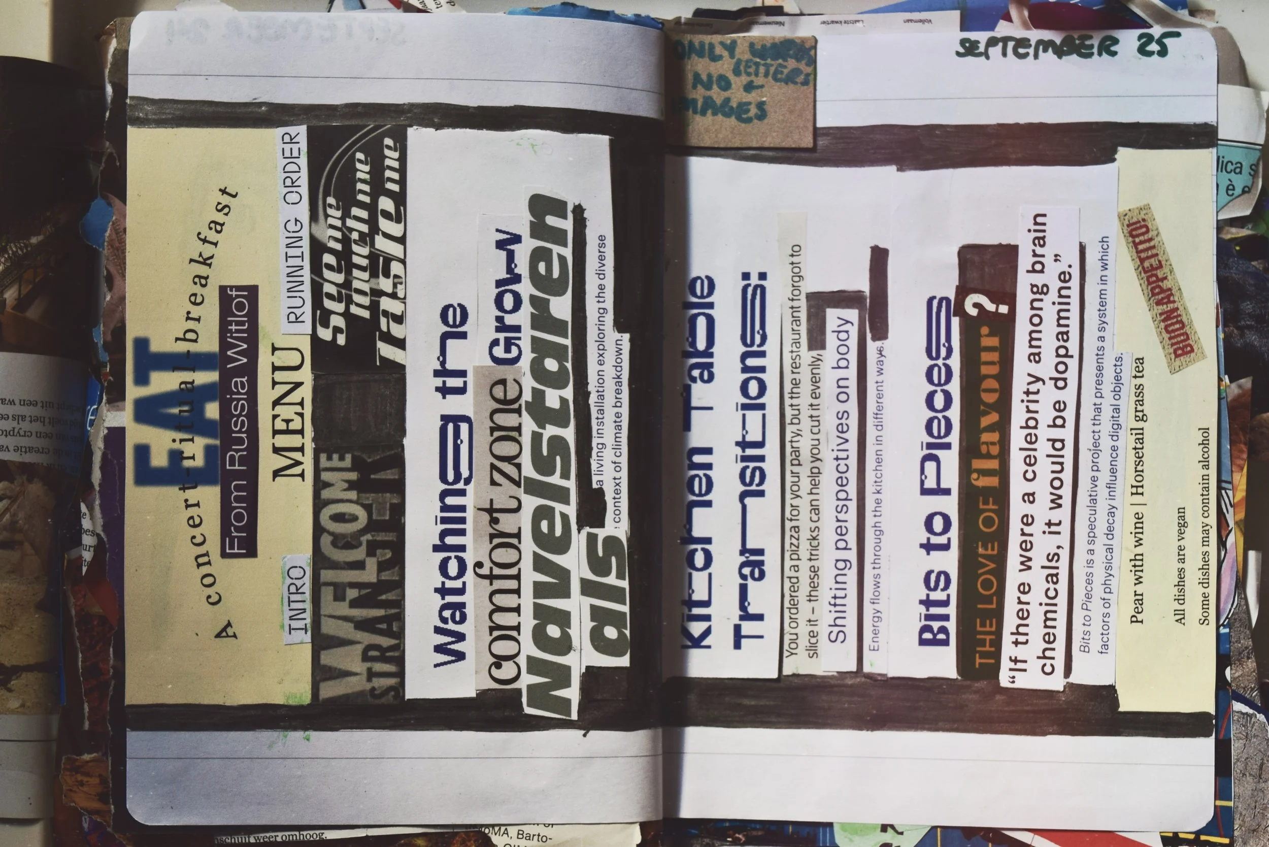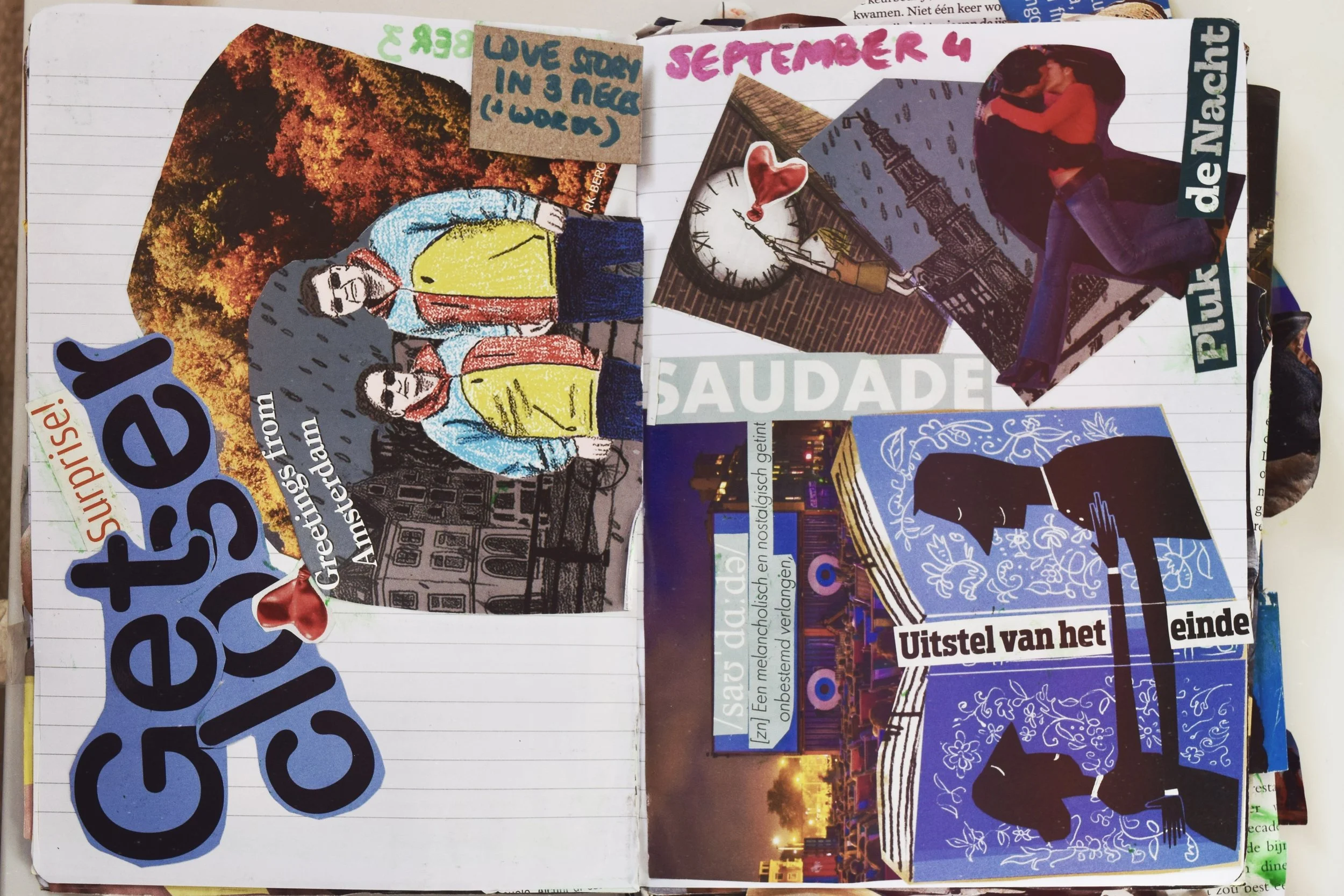 Each day, I’d pull a prompt — making it part creative challenge, part scavenger hunt, part visual diary of my life. Some days it asked me to use only pieces with numbers or of the same colour; other days I’d need to reflect on my summer or create a dialogue using scraps in different languages. Sometimes it made perfect sense, and I had a clear vision right away. Other times, I had no clue what I was doing — even when the collage was done. Some pages came easily; others didn’t want to exist at all.