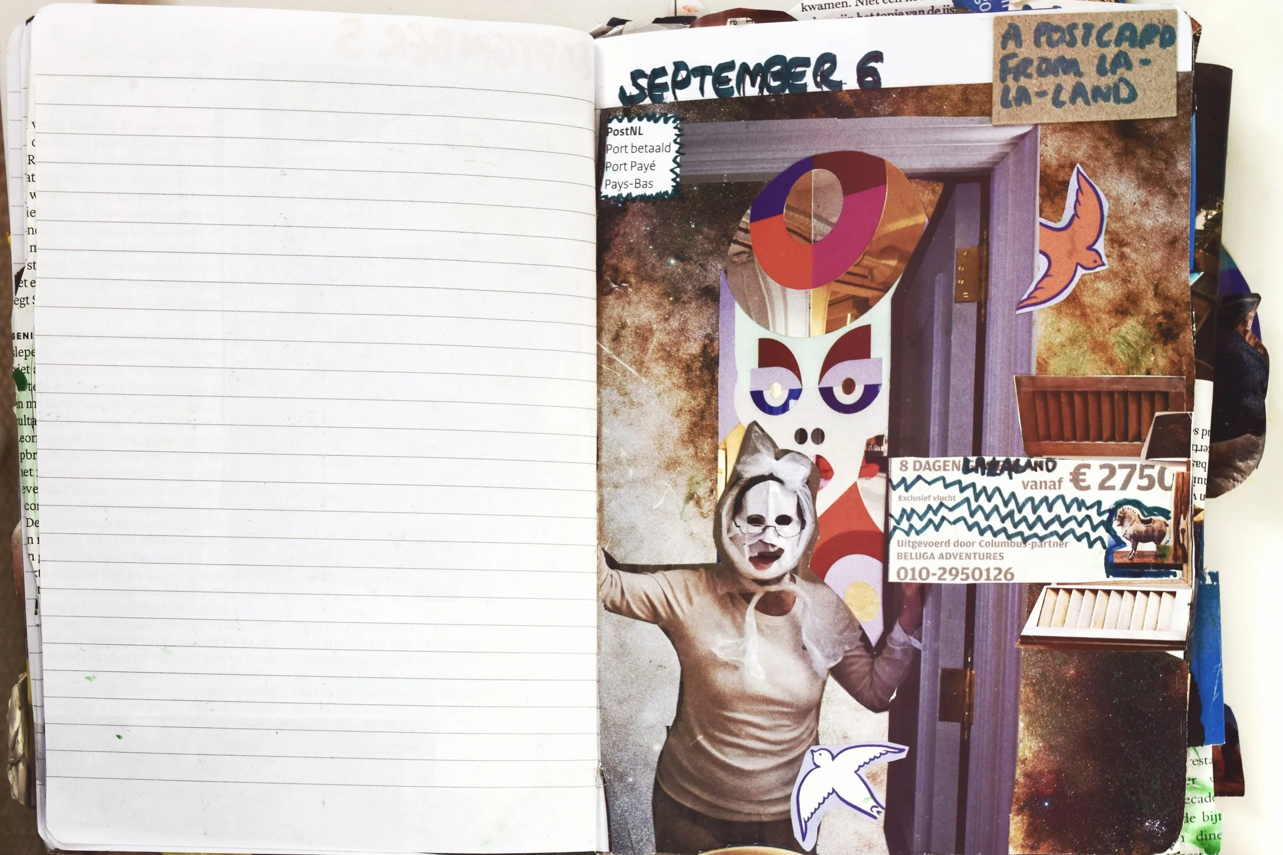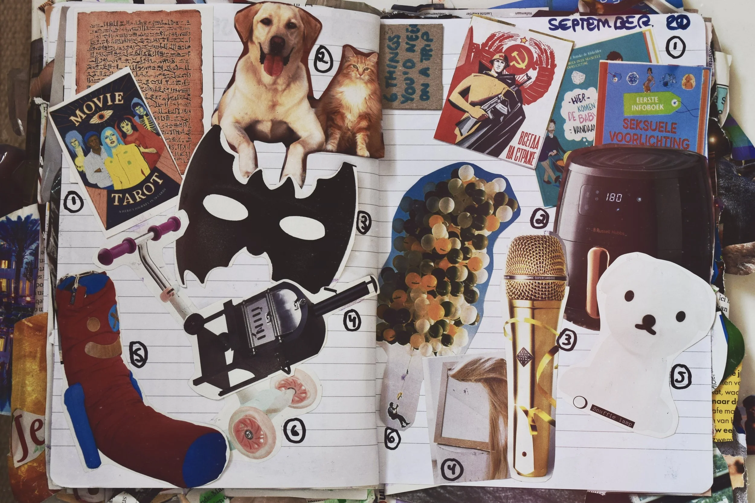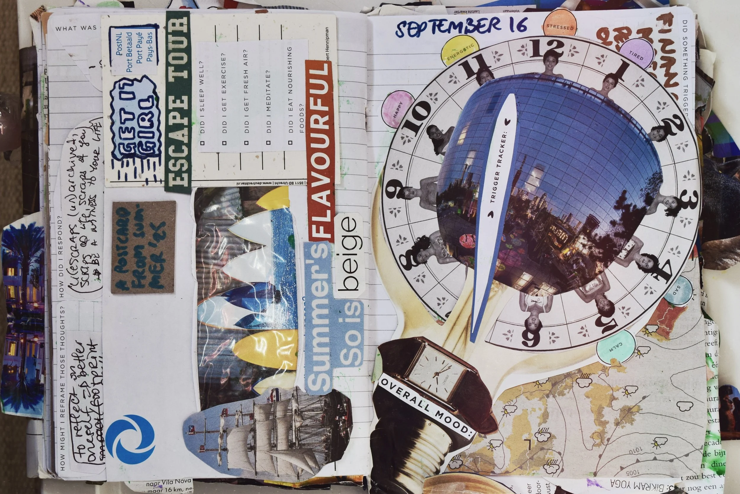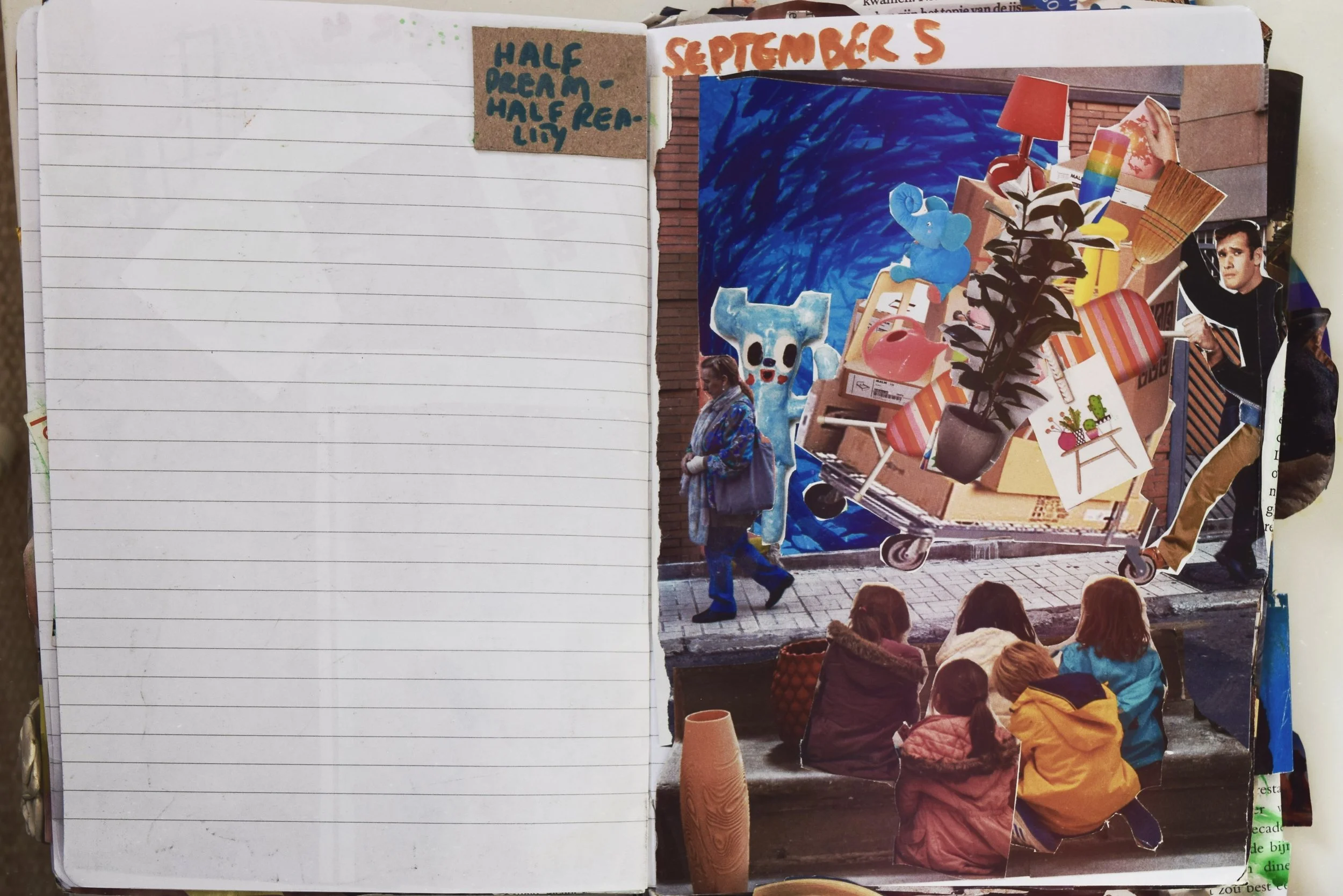 Each day, I’d pull a prompt — making it part creative challenge, part scavenger hunt, part visual diary of my life. Some days it asked me to use only pieces with numbers or of the same colour; other days I’d need to reflect on my summer or create a dialogue using scraps in different languages. Sometimes it made perfect sense, and I had a clear vision right away. Other times, I had no clue what I was doing — even when the collage was done. Some pages came easily; others didn’t want to exist at all.